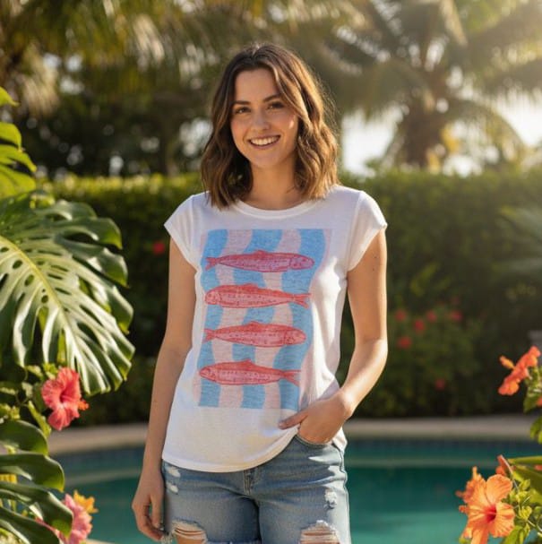 Camiseta feminina baby look mística sardinha peixe crustáceo devore hippie