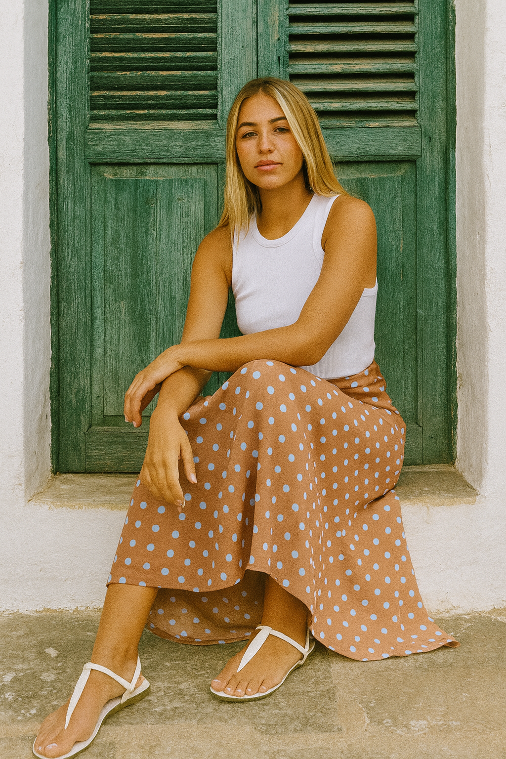 Tendência do verão 2026, saia longa com modelagem exclusiva, confeccionada em viscolinho com elástico na cintura.