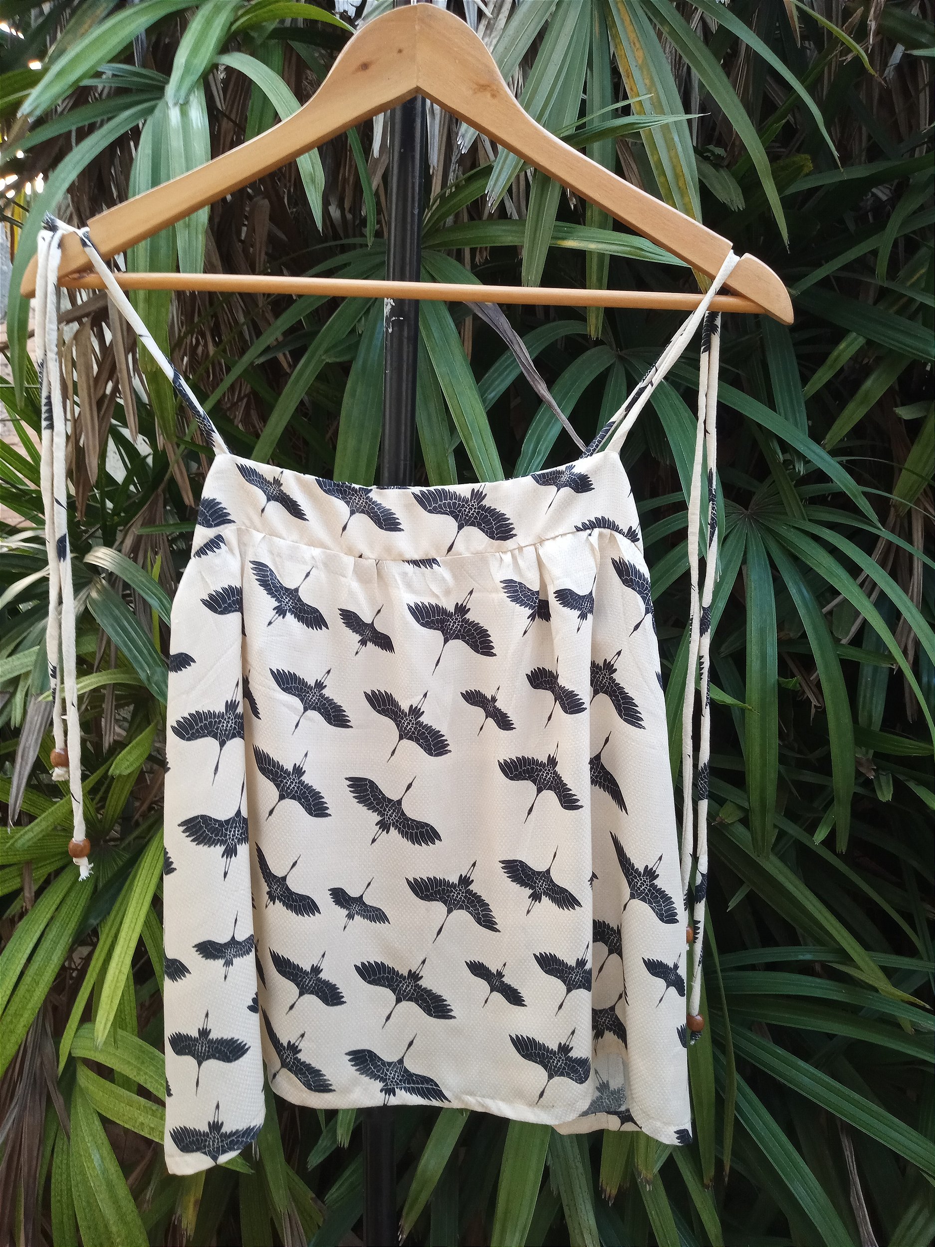 Modelo versátil perfeita para dias quentes. Em crepe de algodão, decote com pala e elástico na parte de trás. Com caimento solto e alças de amarrar. Peça autoral com modelagem exclusiva MAISON HIPPIE.