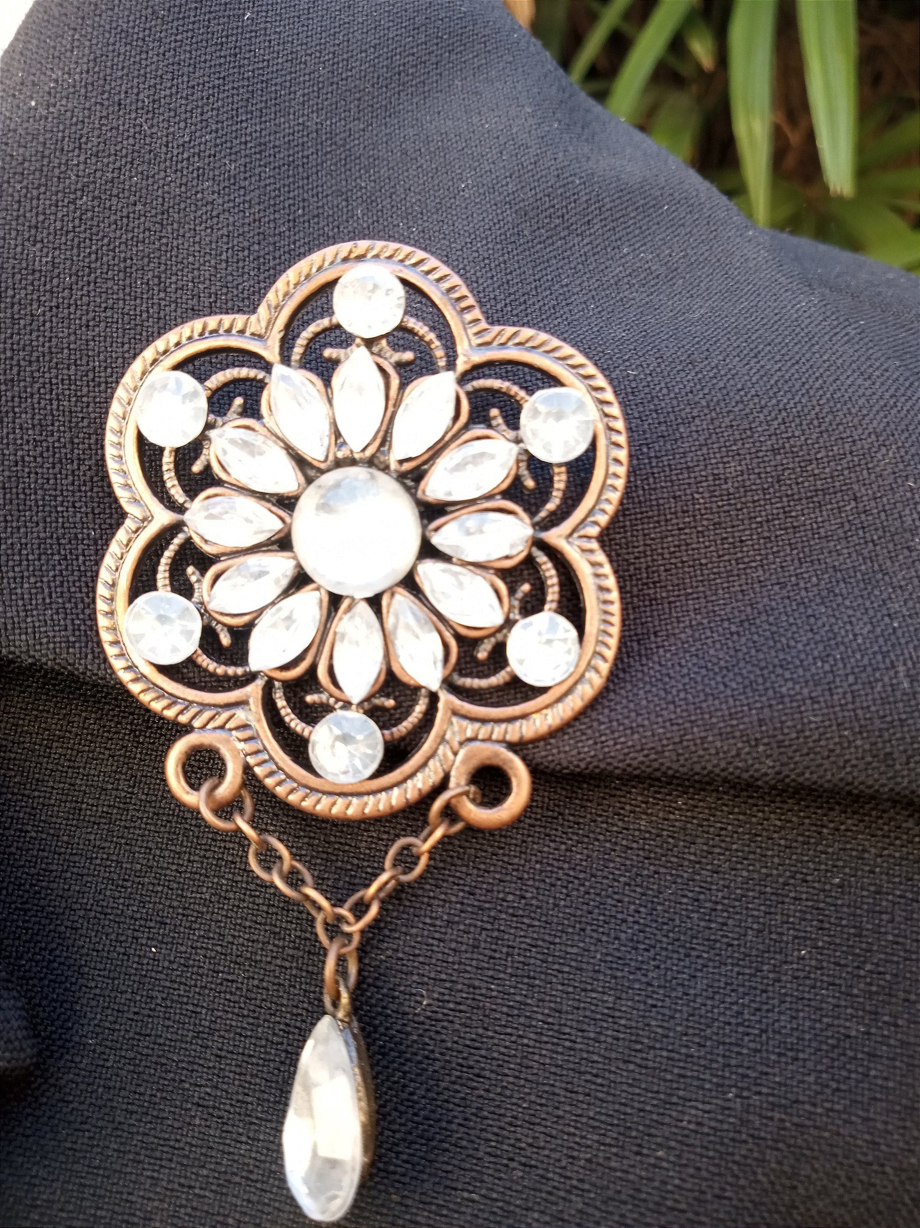 Modelo em liga de metal envelhecido com pedra em zircômia, perfeito para complementar os loks boho de inverno.